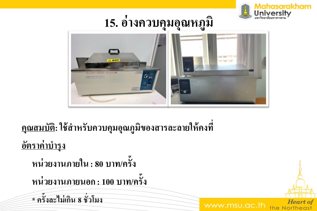 คุณสมบัติ: ใช้สำหรับควบคุมอุณภูมิของสารละลายให้คงที่ อัตราค่าบำรุง หน่วยงานภายใน : 80 บาท/ครั้ง หน่วยงานภายนอก : 100 บาท/ครั้ง * ครั้งละไม่เกิน 8 ชั่วโมง