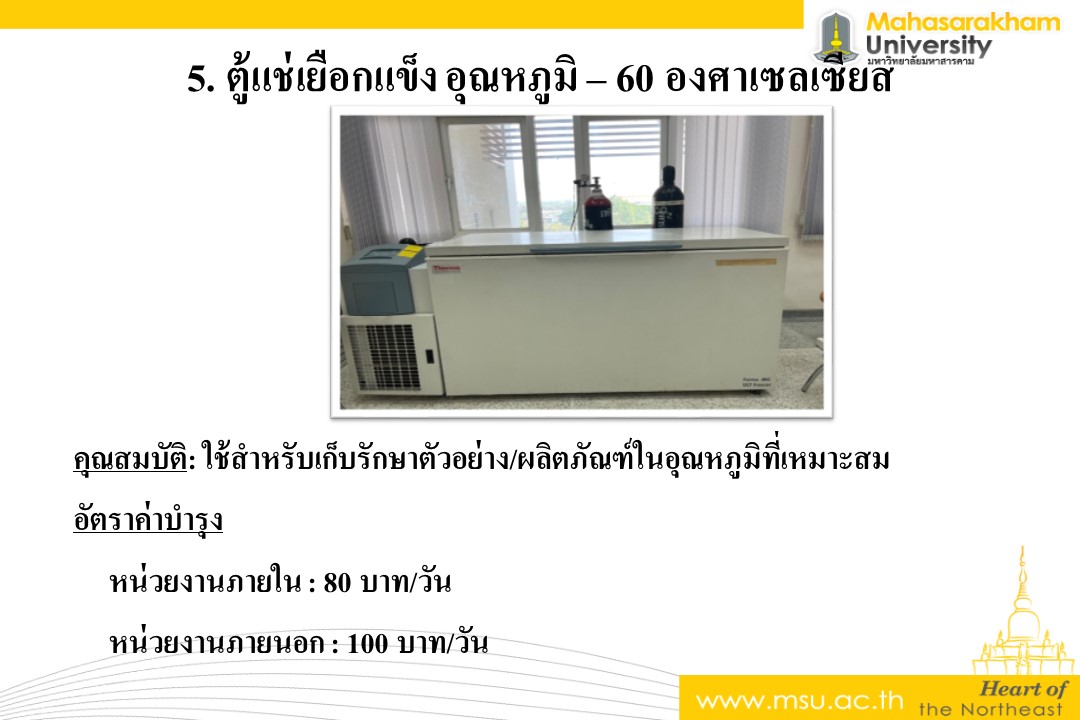 คุณสมบัติ: ใช้สำหรับเก็บรักษาตัวอย่าง/ผลิตภัณฑ์ในอุณหภูมิที่เหมาะสม อัตราค่าบำรุง หน่วยงานภายใน : 80 บาท/วัน หน่วยงานภายนอก : 100 บาท/วัน