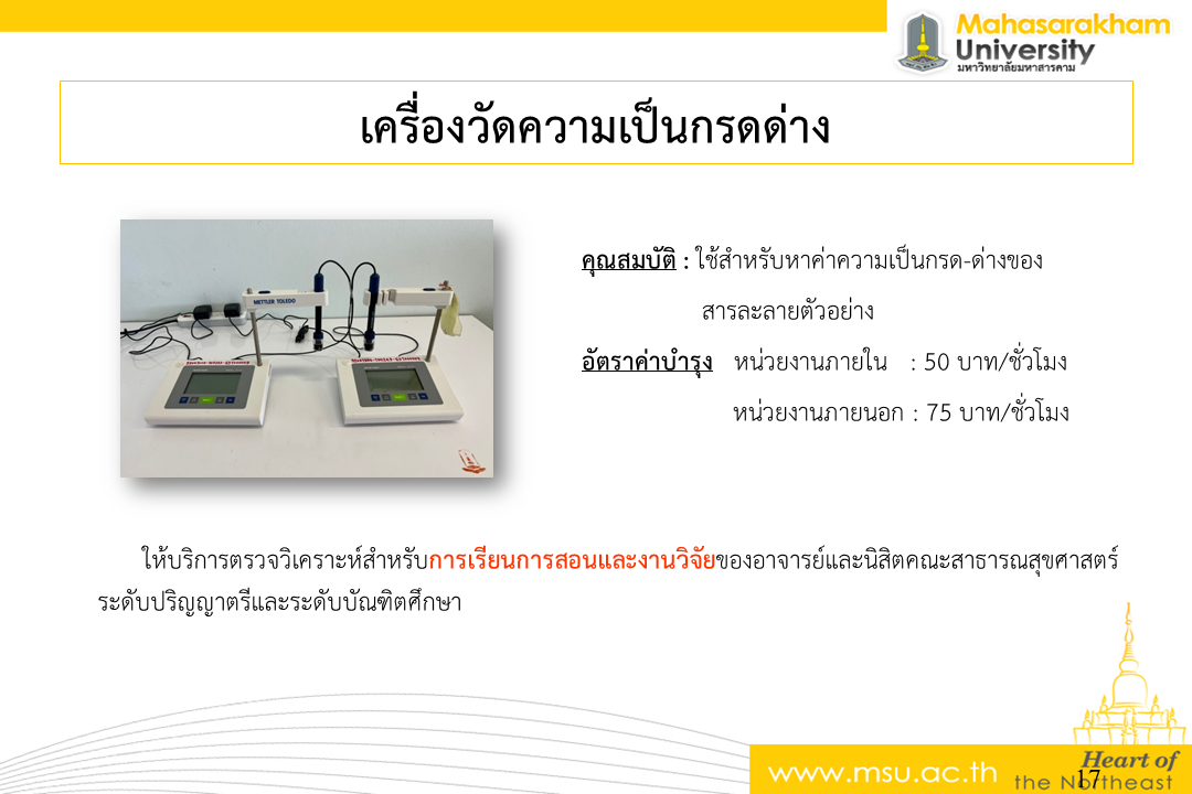คุณสมบัติ : ใช้สำหรับวิเคราะห์และแยกชนิดของสาร อัตราค่าบำรุง หน่วยงานภายใน : 800 บาท/ชั่วโมง หน่วยงานภายนอก : 1,500 บาท/ชั่วโมง ค่าเช่าคอลัมน์ HPLC : 1,000 บาท/ชั่วโมง