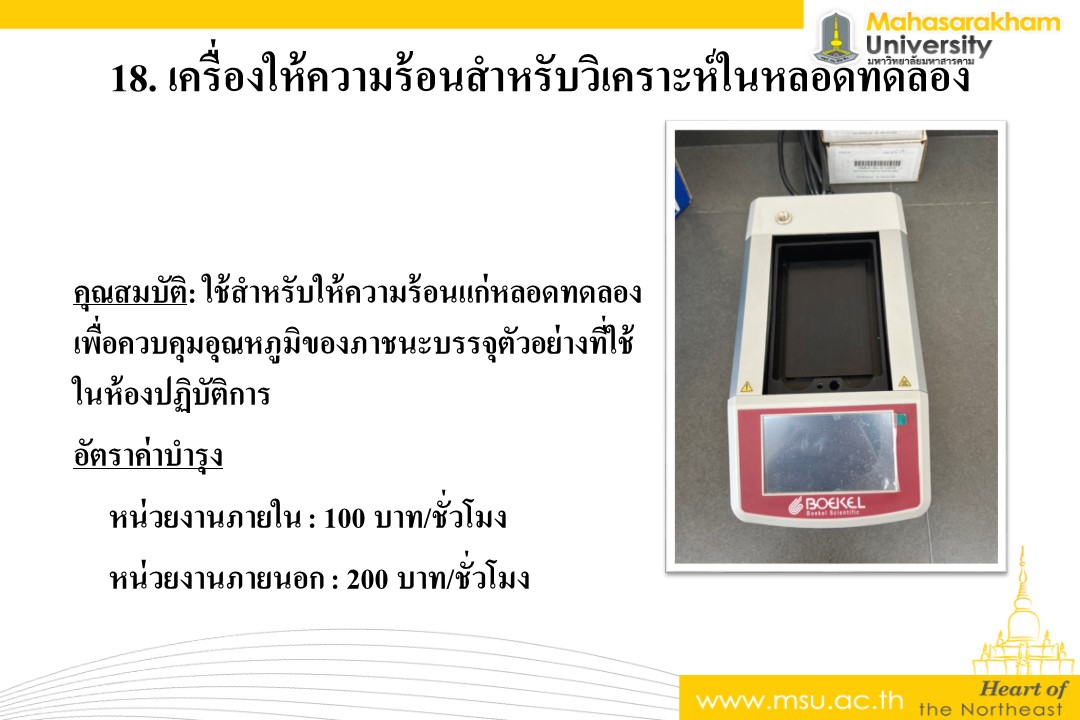 คุณสมบัติ: ใช้สำหรับให้ความร้อนแก่หลอดทดลองเพื่อควบคุมอุณหภูมิของภาชนะบรรจุตัวอย่างที่ใช้ในห้องปฏิบัติการ อัตราค่าบำรุง หน่วยงานภายใน : 100 บาท/ชั่วโมง หน่วยงานภายนอก : 200 บาท/ชั่วโมง