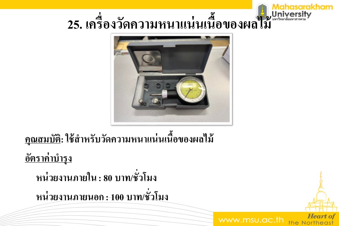 คุณสมบัติ: ใช้สำหรับวัดความหนาแน่นเนื้อของผลไม้ อัตราค่าบำรุง หน่วยงานภายใน : 80 บาท/ชั่วโมง หน่วยงานภายนอก : 100 บาท/ชั่วโมง