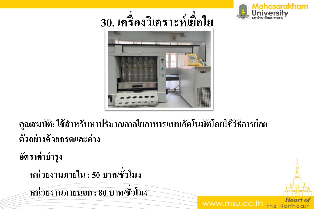 คุณสมบัติ: ใช้สำหรับหาปริมาณกากใยอาหารแบบอัตโนมัติโดยใช้วิธีการย่อยตัวอย่างด้วยกรดและด่าง อัตราค่าบำรุง หน่วยงานภายใน : 50 บาท/ชั่วโมง หน่วยงานภายนอก : 80 บาท/ชั่วโมง